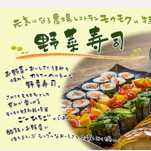 契約農家さんが厳選した野菜をにぎり寿司に仕立てた、モクモクの特別メニュー。ごぼうやなす、葉物やトマトなど、素材の彩りと旨みを生かし、ヘルシーで見た目も楽しいひと皿に。ご飯には特別栽培米「ごーひちご」を使用し、やさしい味わいが広がります。女性やファミリーにも人気の、体が喜ぶ野菜寿司です。